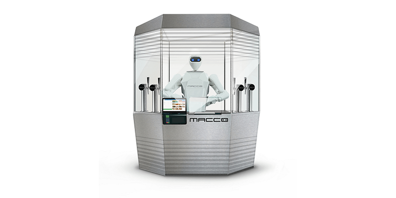 KIME, Macco Robotics’ humanoid robotic bartender, serves beer, coffee, wine, snacks, salads and more. Each KIME kiosk is able to dispense 253 items per hour and features a touchscreen and app-enabled ordering, plus a built-in payment system.