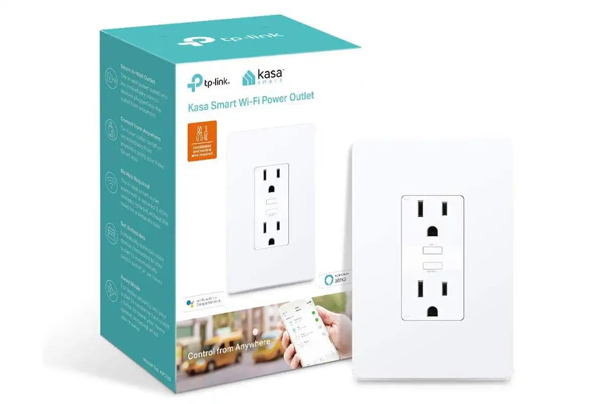 Smart in-wall outlet with two independently controlled sockets, app and voice control, schedules, and WiFi connectivity—no hub required.