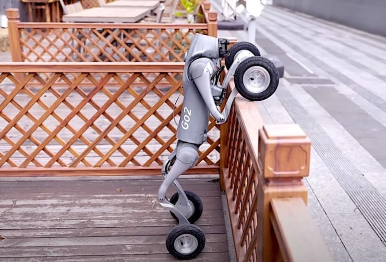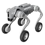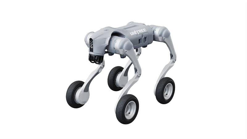 The Unitree Go2-W is a versatile quadruped robot with 7-inch pneumatic tires, capable of speeds up to 2.5 m/s and payloads up to 12 kg, ideal for various inspection and research applications.