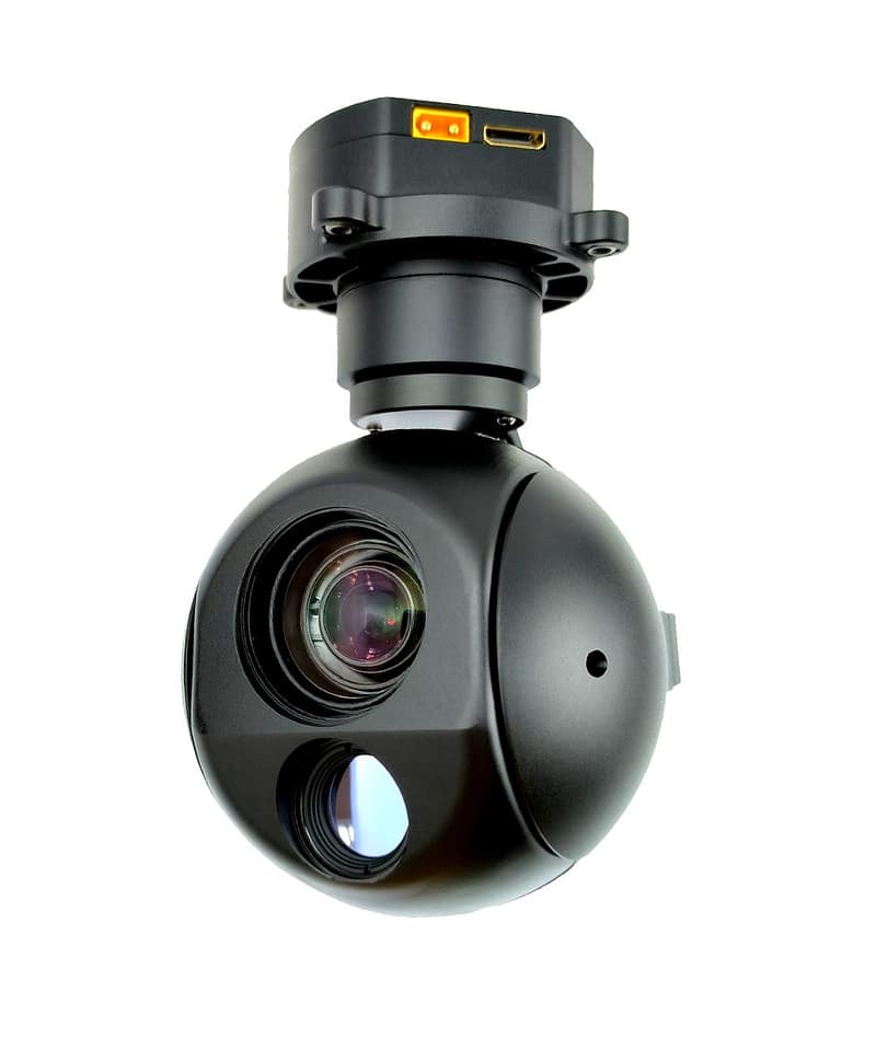 KHY10G613 is a drone gimbal payload which integrating 90x mixed zoom, 2MP EO camera, with 13mm lens 640x512 IR camera, and 3-axis stabilized PTZ. It adopts HDMI and Ethernet output. The EO camera uses a wide dynamic sensor with 2 mega effective pixels; The IR camera adopts 640x512 resolution vanadium oxide detector with baffle design. The system supports picture-in-picture modes, pseudo-color switching. The UART② and IP can synchronously control the camera and PTZ, and support local TF storage.