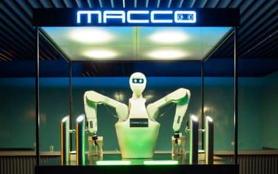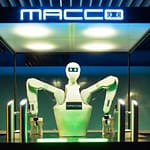 KIMEMacco Robotics’ humanoid robotic bartender, serves beer, coffee, wine, snacks, salads and more. Each KIME kiosk is able to dispense 253 items per hour and features a touchscreen and app-enabled ordering, plus a built-in payment system.