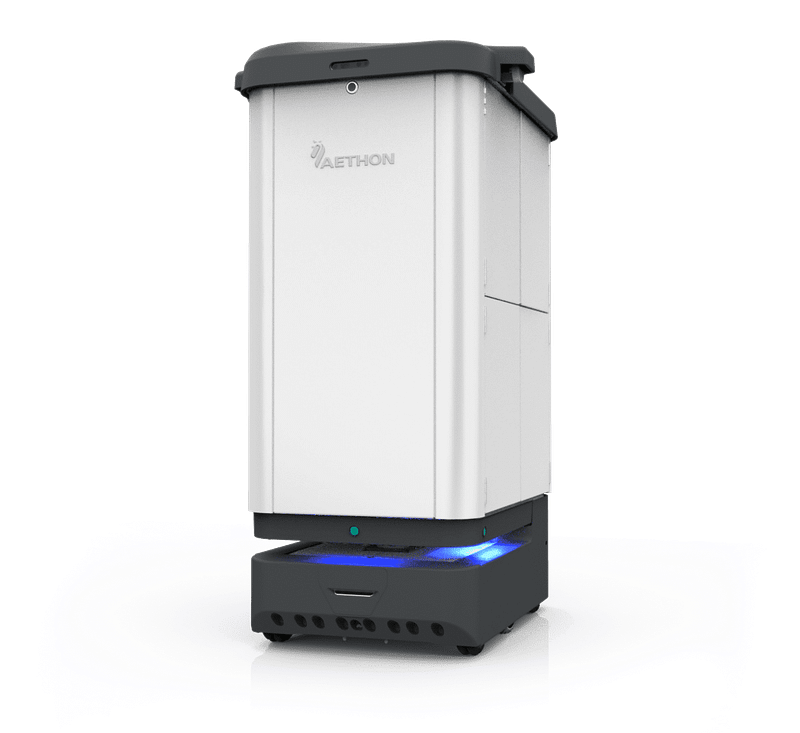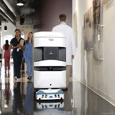 The TUG robot autonomously transports medical supplies, medications, food, and linens in hospitals, reducing staff burden and enhancing workflow efficiency.